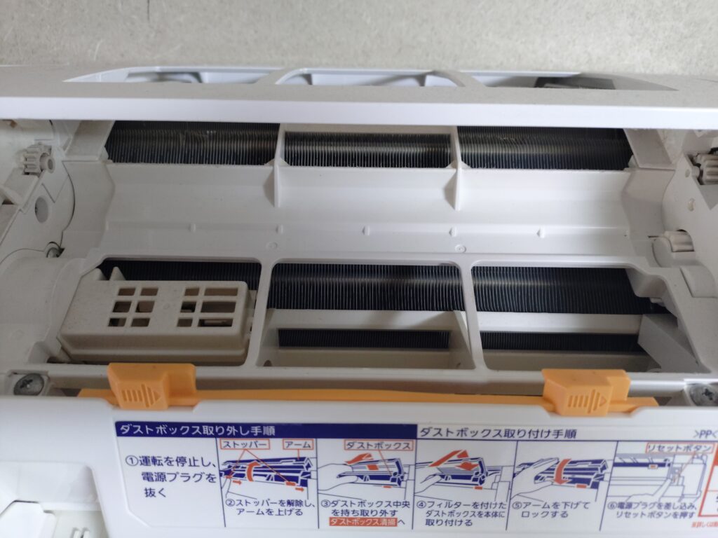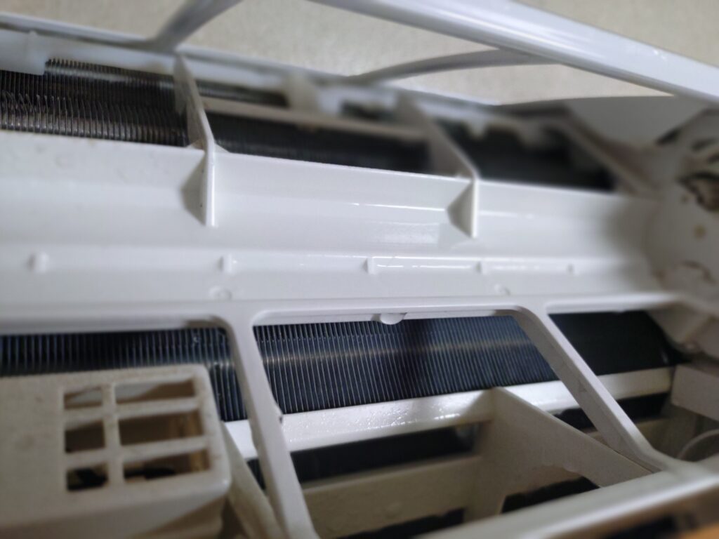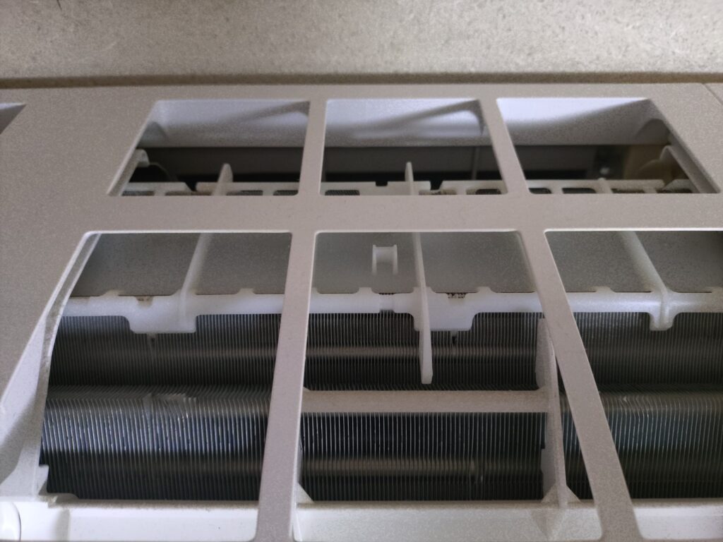 フィルターとカバーを外して、内部の熱交換器(アルミフィン)が見えた瞬間、埃と黒ずみがぎっしり。と思いきや、そうでもありません。