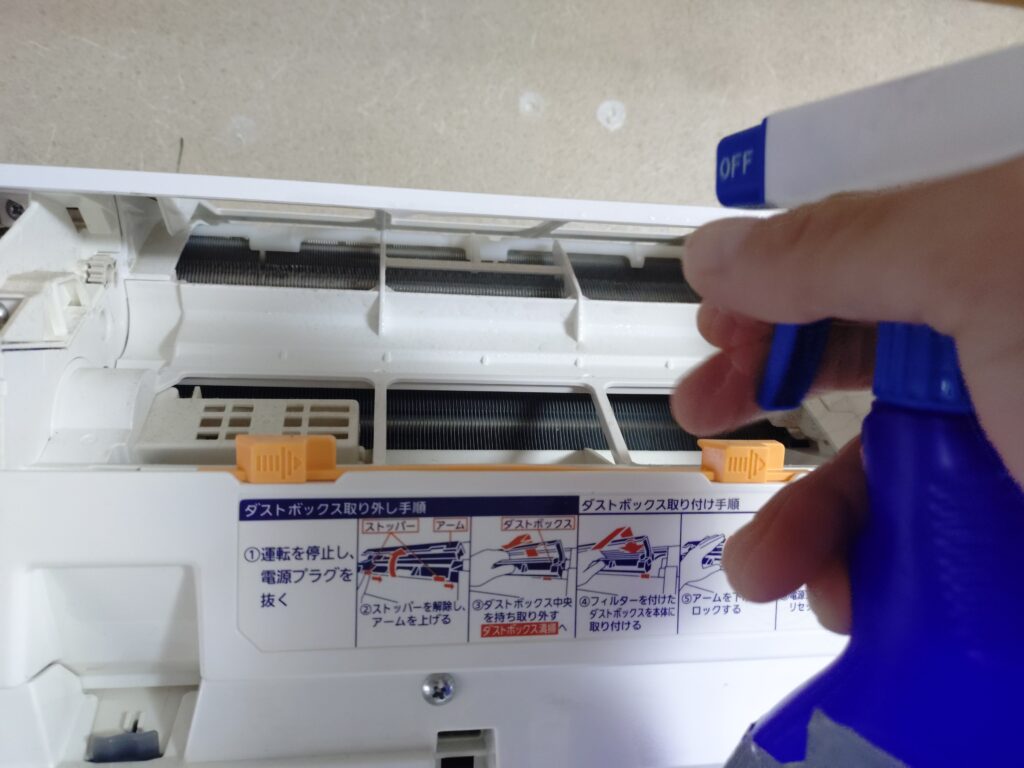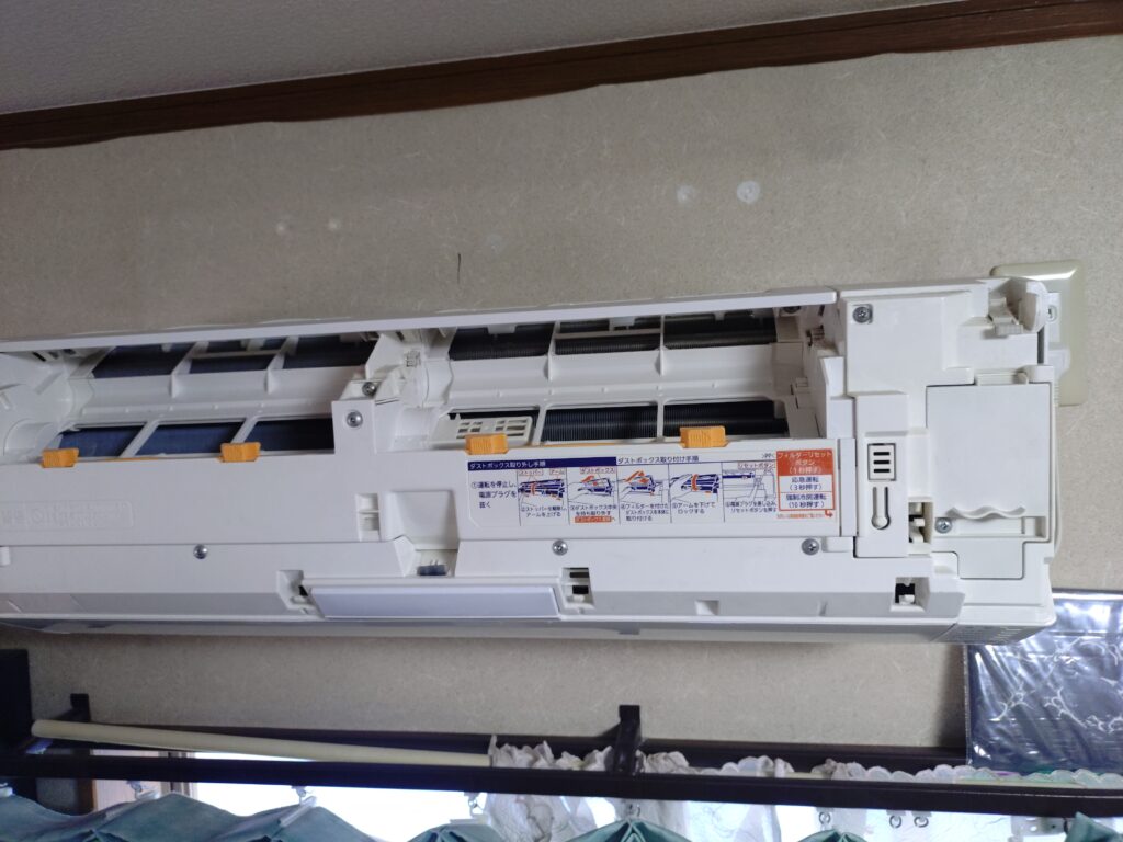 まずフィルターを外しカバーもとっちゃいます。外れないエアコンもあるので無理に外さず目いっぱい上にあがておけば止まります。