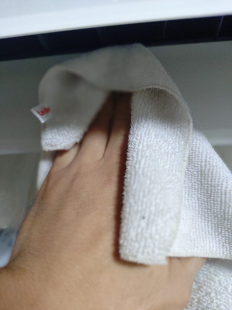 吹き出し口もふき取り掃除です。書き忘れましたが電源コンセントは抜いてください。電源が配電盤直結ならば配電盤のエアコン専用ブレーカーおろしてください。どれが専用ブレーカーか分からなければエアコンを動かしている途中、ブレーカーおろしてエアコンが消えたら該当エアコンブレーカーです。